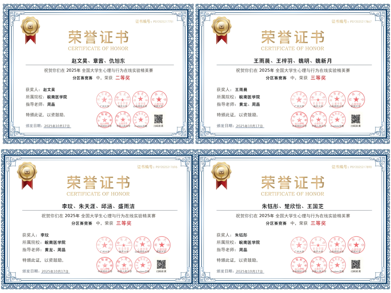 经过激烈而紧张的角逐,最终,公司学子凭借扎实的专业知识和出色的实践能力,取得了优异的成绩。其中,2023级基础医学专业赵文昊(辅修应用心理学专业)团队的作品《负性情绪启动对医员工医疗风险决策的影响及疼痛共情能力的调节作用》,凭借其独特的研究视角和深入的分析,荣获二等奖。同时,2024级应用心理学专业王雨晨团队的作品《贫困感对网络去抑制行为的影响及其机制:基于认知资源有限理论》、2024级应用心理学专业朱钰彤团队的作品《不同表象能力个体在视觉工作记忆任务中的感觉运动策略使用》,以及2023级预防医学李玟(辅修应用心理学专业)团队的作品《从“稀缺感”到“攻击性”:社会规范在老员工群体中的调节作用》,也凭借各自的创新性和研究价值,荣获三等奖。