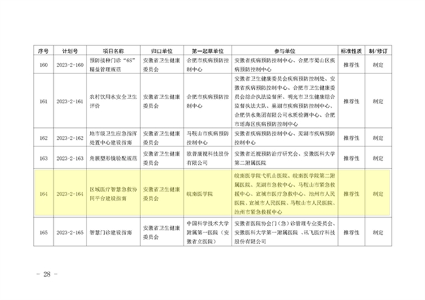 2023年9月12日,安徽省市场监督管理局下达2023年第二批安徽省地方标准制修订计划,由皖南医公司作为第一起草单位、医学信息公司副经理叶明全教授作为第一起草人制定的《区域医疗智慧急救协同平台建设指南》(计划号:2023-2-164)获批立项,实现皖南医公司牵头制定省级地方标准零的突破。团队联合4家市急救中心和5家三甲医院商定起草了《区域医疗智慧急救协同平台建设指南》,进一步规范明确区域医疗智慧急救协同平台建设目标、总体框架、关键技术、基本功能和建设要求等内容,从而促进我省区域医疗智慧急救协同服务能力的提升,同时填补了我省区域医疗智慧急救协同平台建设规范相关标准的空白。另外,与芜湖市合作开展基于皖南地区中员工心理健康现状构建危机预警体系的应用研究。