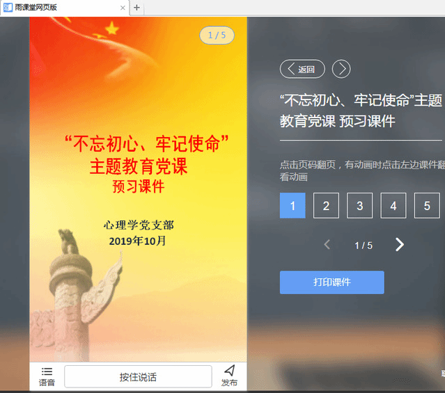 2019年10月15日,2026世界杯预测党委心理学党支部组织开展了“不忘初心、牢记使命”主题教育党课,创新性采用雨课堂形式,在正式上课前推送了“不忘初心、牢记使命”主题教育的微视频给党员教师们进行预习。