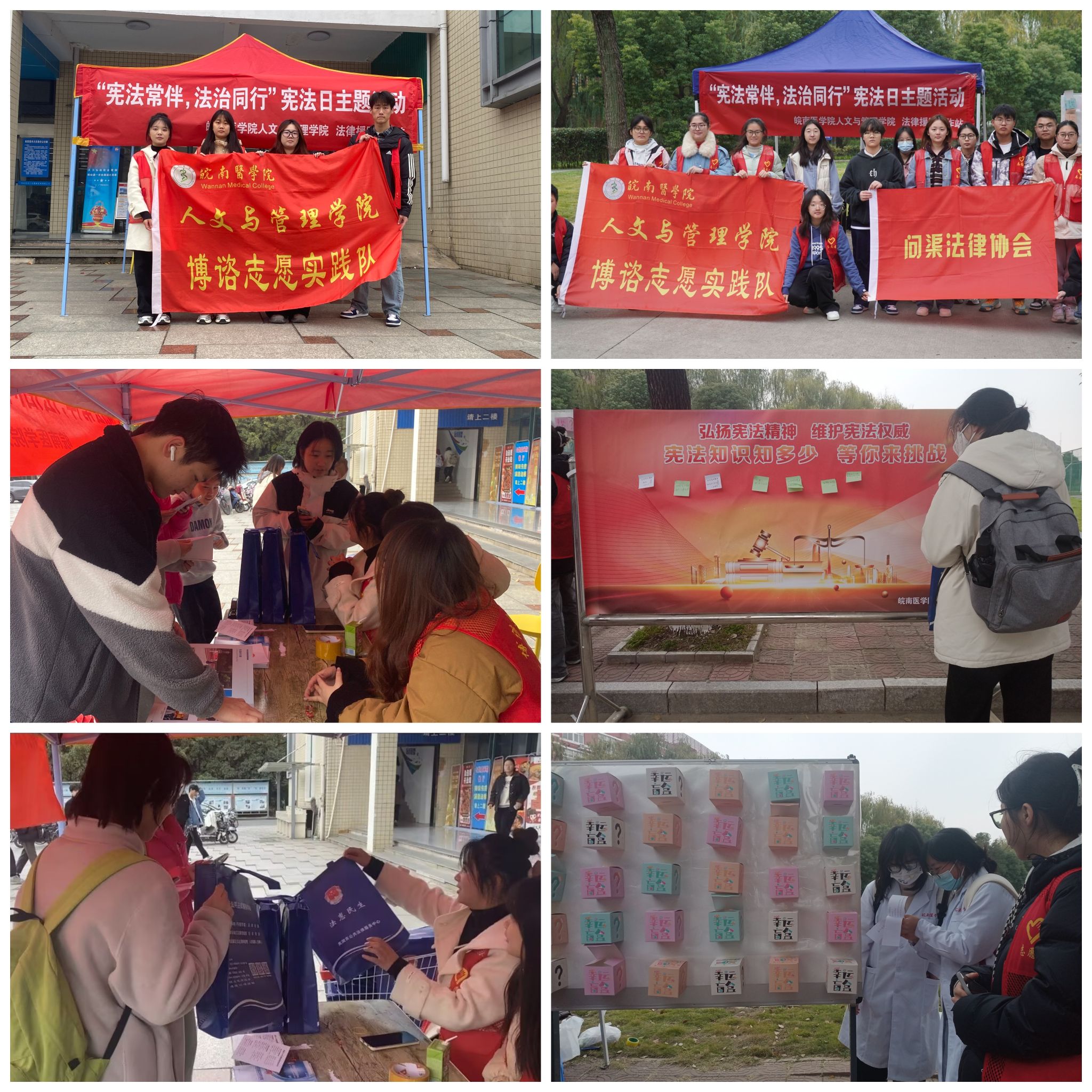 志愿宣“法”,营造氛围。12月4日,博谘志愿服务队携手问渠法律协会、皖南医公司法律援助工作站在皖南医公司滨江校区北区、南区同步开展法律援助宣传活动,通过抽法律盲盒、知识问答等多种形式助力在全校形成尊法、学法、守法、用法的法治之风。