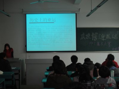 展示台上,同学们轮流向观众展示了自己精心制作的精美PPT,并引用大量材料来介绍世博会和亚运会的一些基本知识。赛后,经过评委们的严格评分,最终何秀芳组、朱煜组、郑茹秋组获得了本次比赛的前三名。