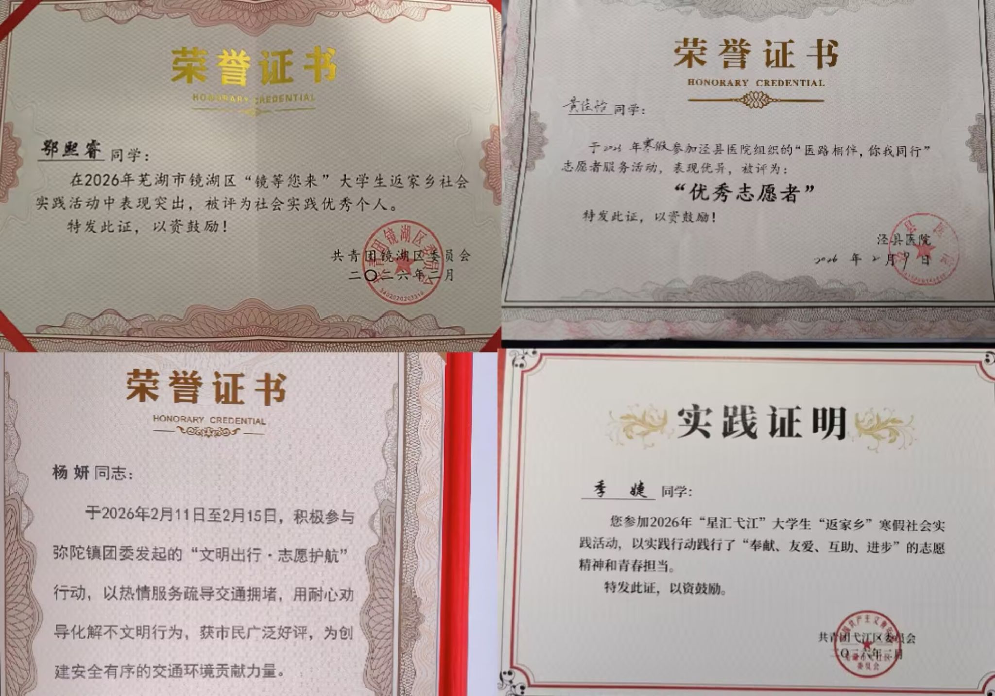 实践中,队员们立足专业、服务基层,在奉献中锤炼本领,展现皖医学子风采。多名志愿者获评优秀志愿者、社会实践优秀个人等荣誉。
