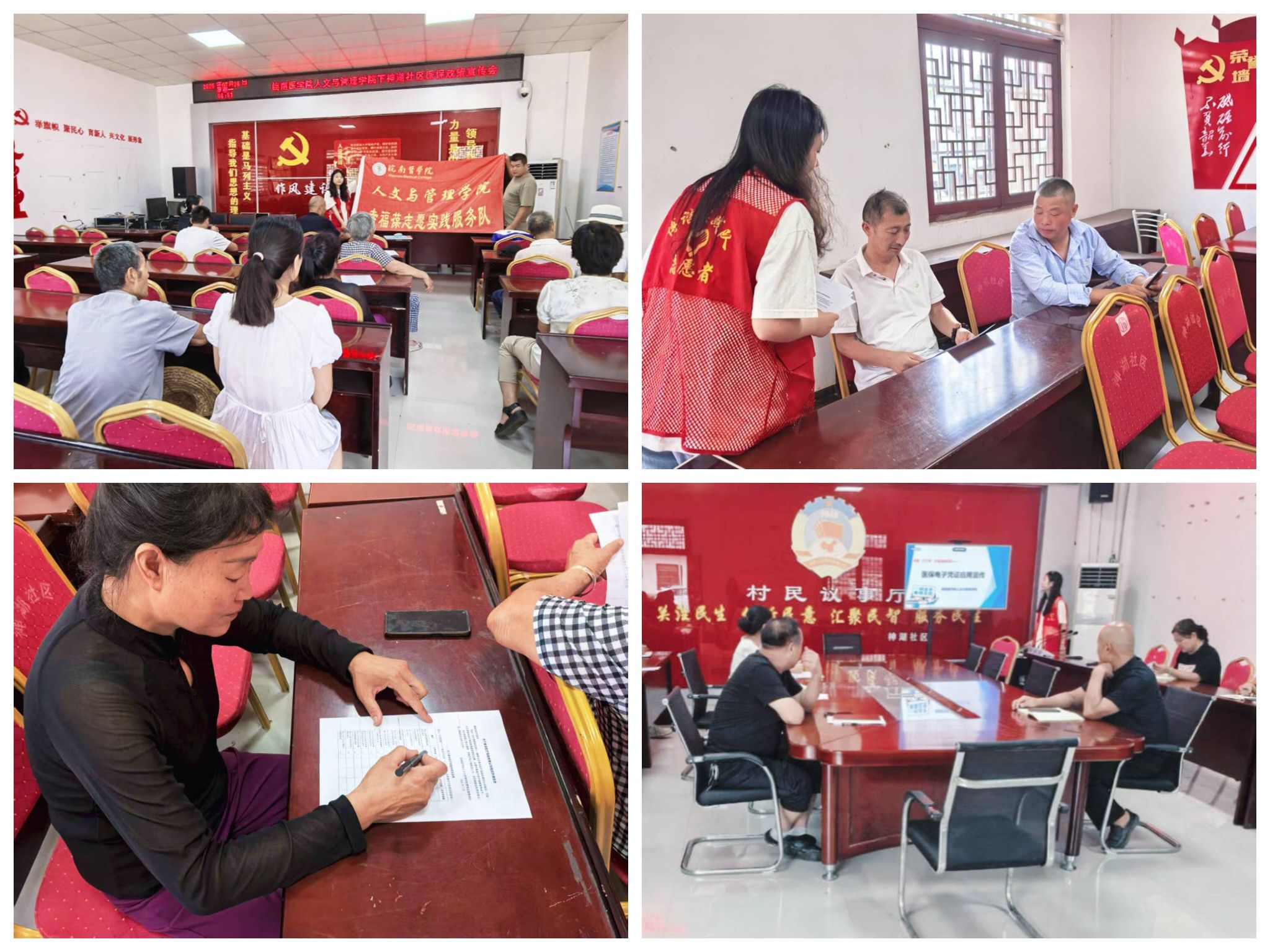医保政策送上门,便民服务零距离。“博谘·幸福葆”实践队致力于推动医保政策普惠于民。队员们针对社区工作人员开展政策解读培训,面向居民设立宣讲台,并创新采用“一对一访谈代填”方式帮助老年群体完成调研,有效扫除了政策认知盲区,提升了医保电子凭证的知晓率与使用率,将便捷与关怀送到居民身边。