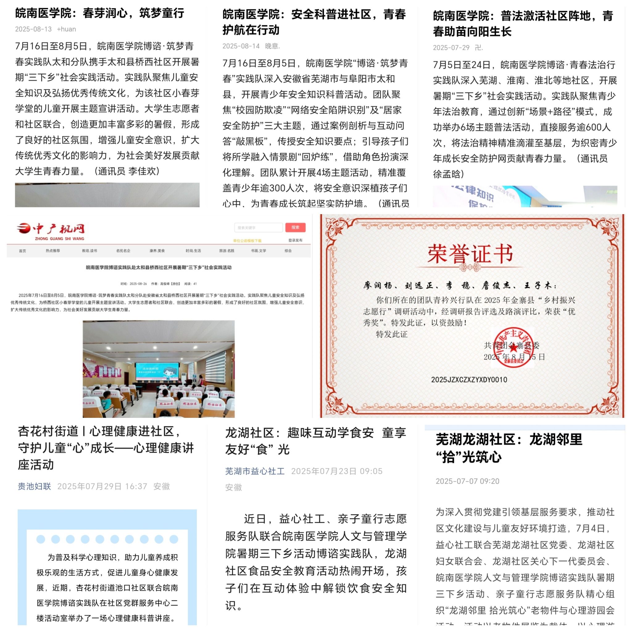 硕果盈枝誉满行,媒体聚焦声名扬。今夏实践成果丰硕,143名同学踊跃参与,11支实践团队各展所长。其中,“博谘·心梦”实践队获评团中央暑期“三下乡”全国重点团队,“博谘·筑梦青春”“博谘·青春法治行”两支队伍获评校级重点团队。活动期间,相关实践事迹获19篇媒体报道,涵盖国家级4篇、省级4篇,社会影响力广泛,赢得多方聚焦与赞誉。这些荣誉不仅是对全体参与者辛勤付出的充分肯定,更是青春力量扎根实践、服务社会的生动见证。