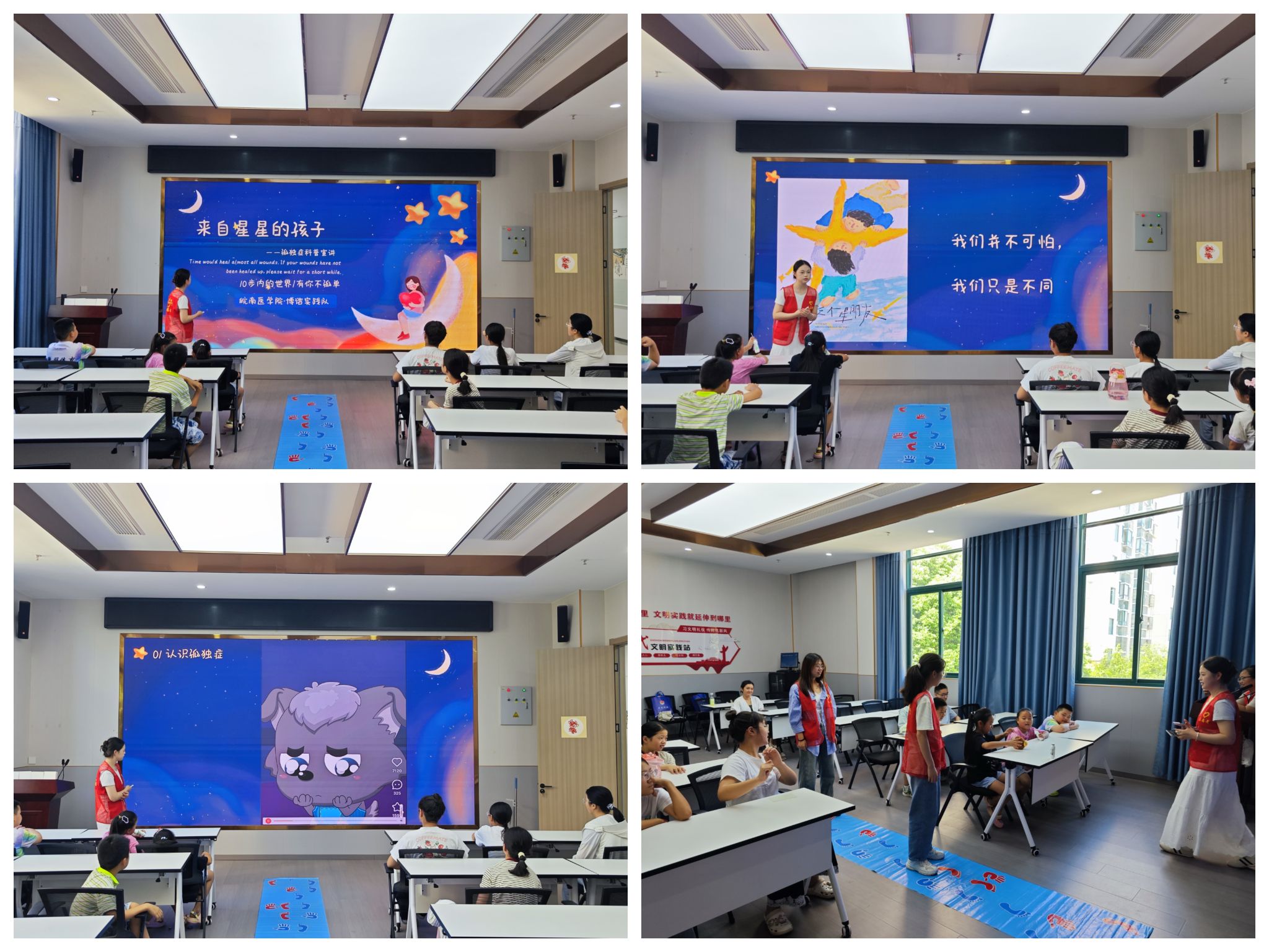 启理解之窗,温情互动架起“星空桥梁”。7月7日,实践队温情开启孤独症科普之旅。活动现场童趣盎然,队员们转变为“科普小老师”,借助卡通PPT与温馨动画,将孤独症儿童喻为“来自星星的孩子”,形象诠释其独特的交流方式与兴趣世界。在热烈讨论中,理解与包容的桥梁悄然筑起。“原来他们不是不理人,是需要我们用特别的方式交朋友!”孩子们质朴的感悟,检验了活动成功播下的善意。