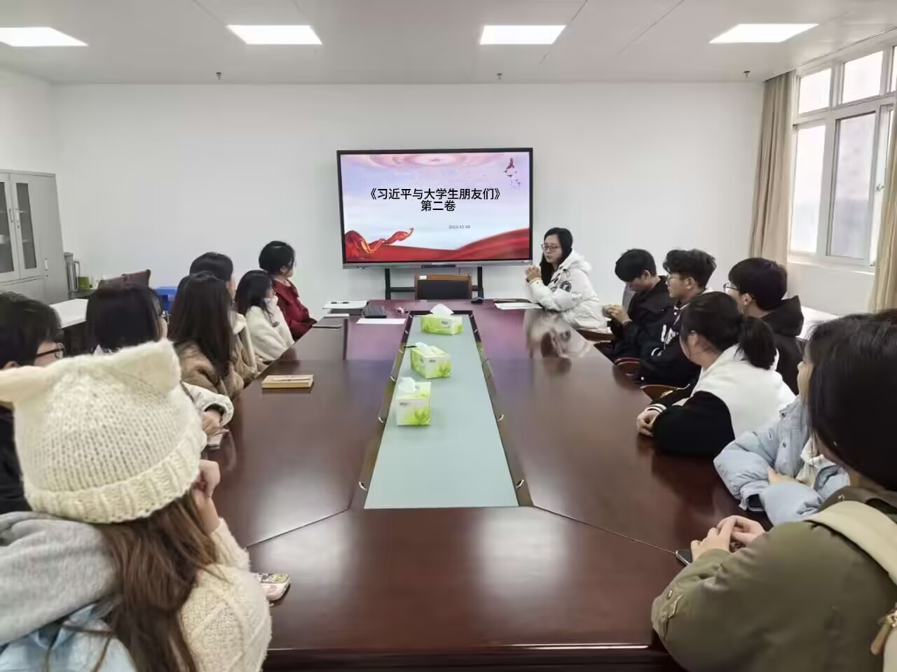 《习近平与老员工朋友们》第二卷通过24篇访谈实录讲述了习近平同志在中央和地方工作期间,深入高校调研考察、关心指导老员工的生动故事。张露在读书会上,号召广大青年深刻领悟习近平总书记关于青年工作的重要思想和关于教育的重要论述的形成过程和发展脉络,准确把握党的创新理论的世界观方法论,更加深刻领悟“两个确立”的决定性意义,不断增强“四个意识”、坚定“四个自信”、做到“两个维护”,践行“两个确立”。读书分享阶段,同学们表示将深刻领会习近平总书记指引的青春航向,时刻牢记党和人民的殷切期待,争做有理想、敢担当、能吃苦、肯奋斗的新时代好青年。
