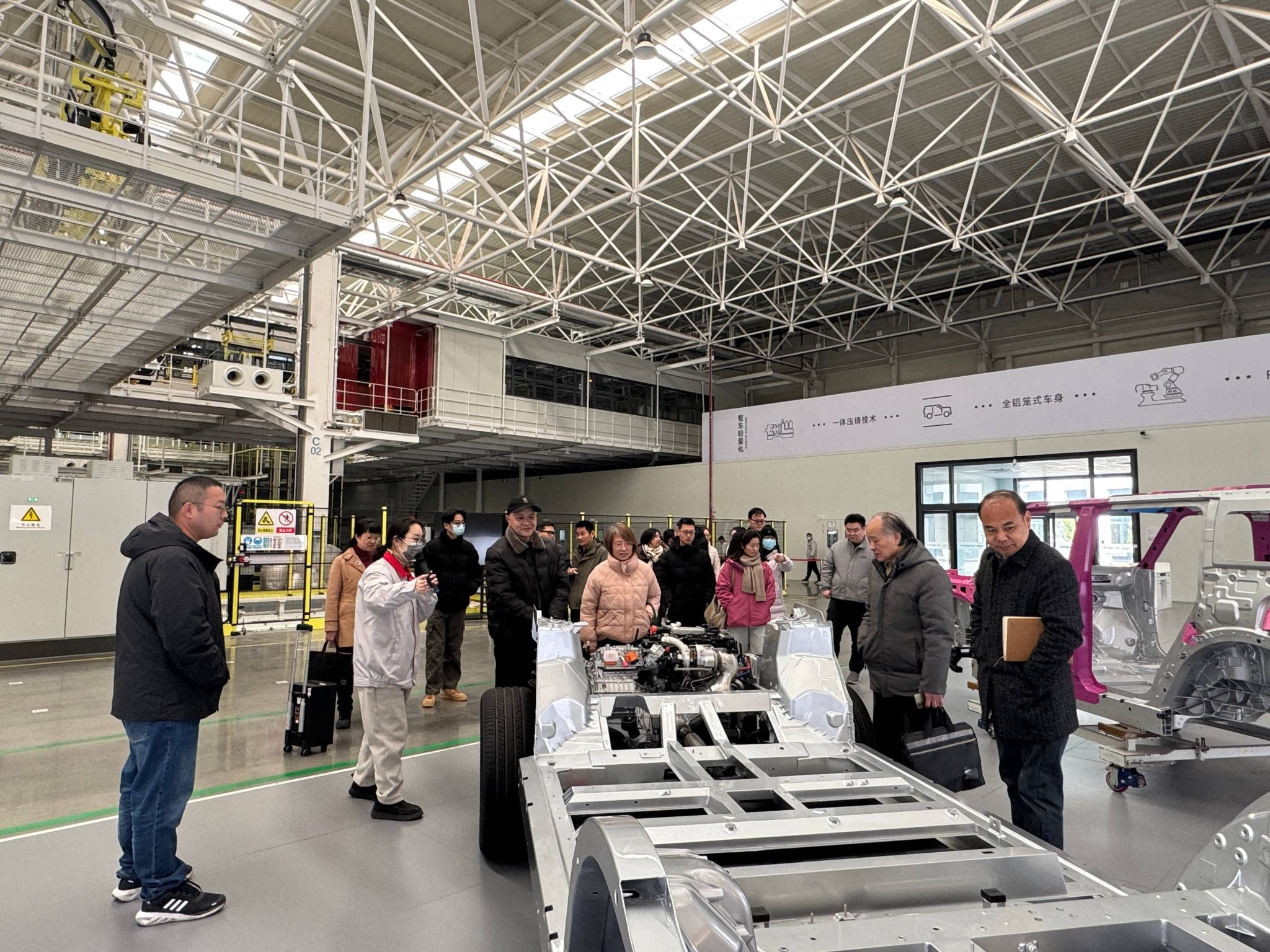 在工厂讲解员的引导下,教职工一行先后参观了冲压、焊装、总装等核心生产车间,现场的智能化生产场景让大家直观感受到新质生产力为制造业带来的变革。讲解员详细介绍了工厂“智能、定制、绿色”的核心定位与“自动化、信息化、柔性化”的发展特色,以及在绿色制造领域的实践成果——采用水性漆技术改善作业环境、依托光伏发电实现节能减碳等先进举措,使大家对“智能制造”与“绿色发展”相融合的产业理念有了深刻认知。