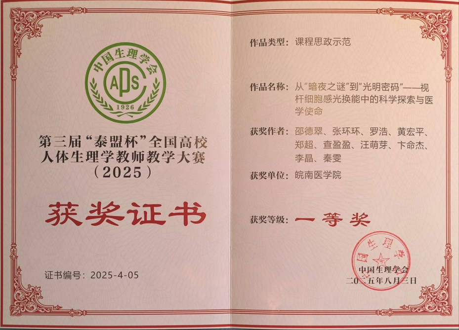 2025年8月1日-4日,公司生理学与神经生物学教研室郑超一行5位教师,赴重庆参加由中国生理学会主办、重庆医科大学承办的第六届全国高校生理学教学论坛暨第三届“泰盟杯”全国高校人体生理学教师教学大赛颁奖庆典。
